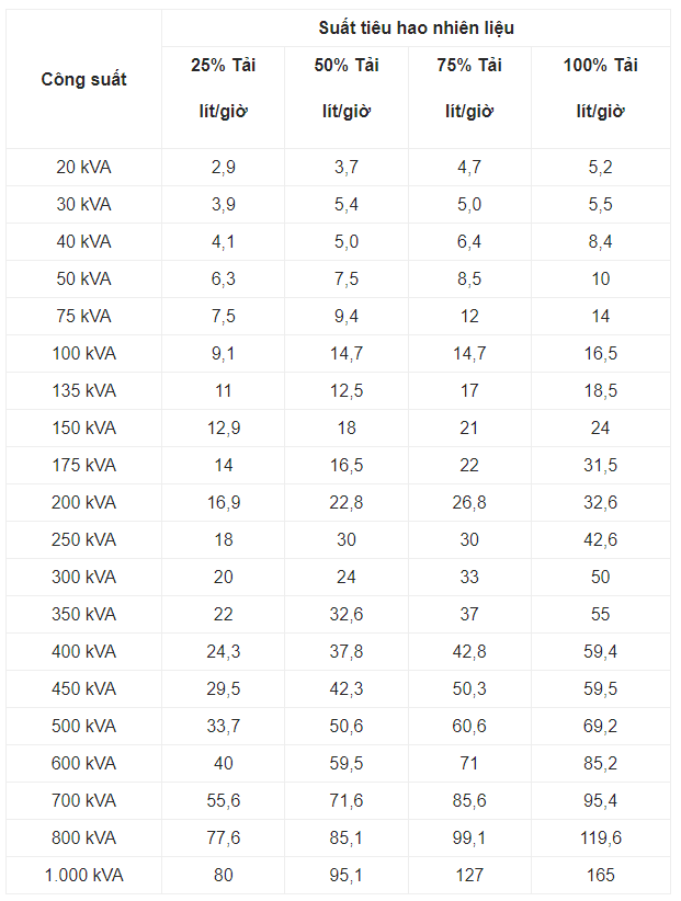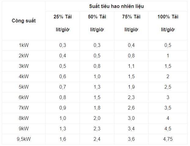 Để quy đổi ra lít thì ví dụ 1 lít dầu có trọng lượng là 800g vậy lượng tiêu hao dầu Diesel của công suất 1kW tối đa trong 1 giờ sẽ là: 210g = x lít (0,2625 lít). Như vậy máy có công suất 10KW thì lượng nhiên liệu tiêu hao là: x lít * 10 = 2,625 lít.