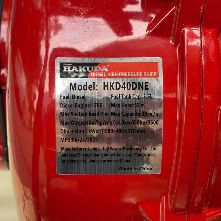 – Máy bơm nước chạy dầu cao áp 4KW HAKUDA HKD40DNE có đề với lực hút mạnh, lưu lượng lớn, thiết kế nhỏ gọn, được sử dụng rộng rãi trong nông nghiệp, thủy lợi, thủy sản, xây dựng, phòng chống lũ lụt và cứu hộ khẩn cấp.