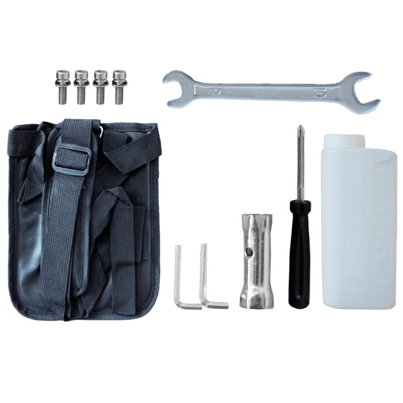 Bộ phụ tùng dụng cụ bao gồm : 1 bình pha, 1 dây đeo và pas gắn dây đeo 1 cái, 1 lưỡi cắt cỏ (305mm x 90mm x 25,4mm x 1,6mm), 1 chắn cỏ, 1 tay cầm trái và 1 bịch phụ tùng (bulon, lục giác, lục giác 4 – 5, khóa mở bugi).