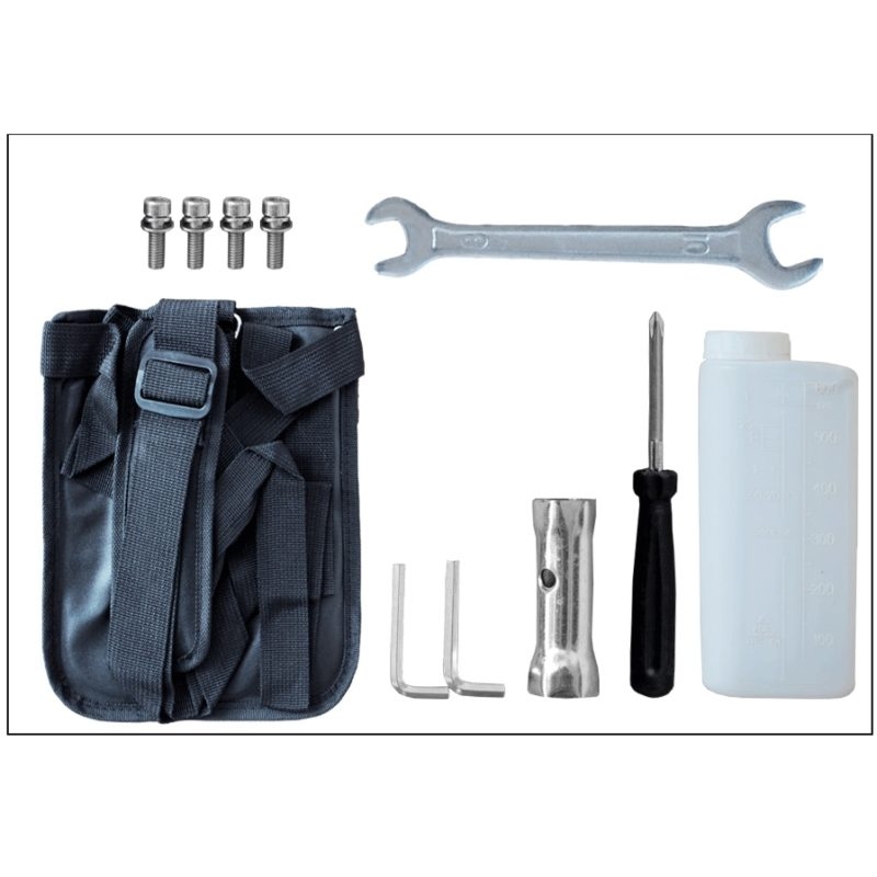 Bộ phụ tùng dụng cụ bao gồm : 1 bình pha, 1 dây đeo và pas gắn dây đeo 1 cái, 1 lưỡi cắt cỏ (305mm x 90mm x 25,4mm x 1,6mm), 1 chắn cỏ, 1 tay cầm trái và 1 bịch phụ tùng (bulon, lục giác, lục giác 4 – 5, khóa mở bugi).