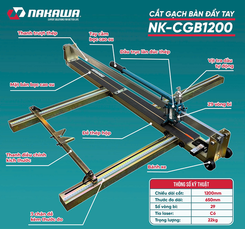 Máy cắt gạch bàn đẩy tay 1200mm NAKAWA NK-CGB1200 có thể dùng để cắt gạch lát nền, gạch ốp tường, gạch bông, gạch đá hoa cương, gạch men,… một cách dễ dàng, nhanh chóng và nhất là đường cắt đẹp, chính xác đúng như ý muốn của người cắt góp phần hoàn thiện các công trình dây dựng, ốp lát,…