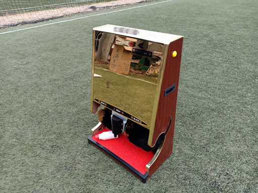 – Máy có cấu tạo hình khối với các đường nét vuông vắn, được làm từ thép cùng gỗ với màu vàng nổi bật.