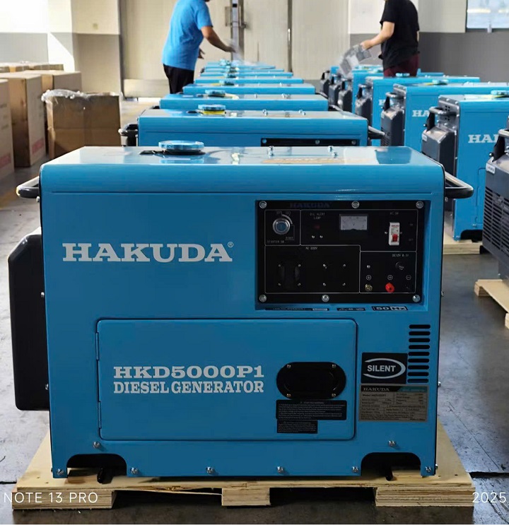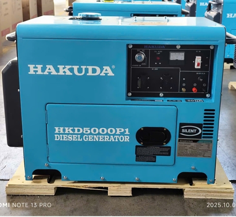 – Máy phát điện chạy dầu HAKUDA HKD5000P1 5KW siêu cách âm có thể cung cấp công suất liên tục 5kw điện cho các thiết bị sử dụng trong gia đình như đèn chiếu sáng, quạt gió, nồi cơm, tivi, tủ lạnh, điều hòa.