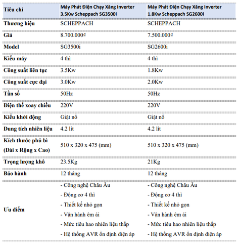 Bảng so sánh này giúp bạn có cái nhìn tổng quan về các tính năng và thông số kỹ thuật của hai mẫu máy phát điện Inverter 3.5Kw Scheppach SG3500i và Inverter 1.8Kw Scheppach SG2600i để có thể đưa ra quyết định phù hợp với nhu cầu sử dụng của mình: