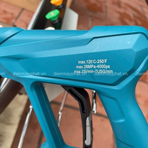 – Ấn vào cò đầu phun và bật vòi nước để xả không khí bên trong máy.