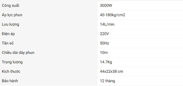 Với mức công suất 3Kw và áp suất dao động 40-180bar, người sở hữu sẽ cảm thấy hài lòng khi sử dụng thiết bị này bởi khả năng làm sạch vết bẩn dễ dàng và tiết kiệm tối đa mọi chi phí.