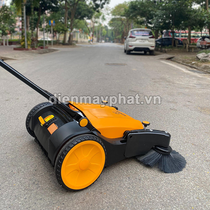 – Theo đó, người dùng chỉ cần dùng tay đẩy nhẹ máy từ phía tay cầm để di chuyển máy -> 2 chổi 2 bên sẽ quay tự động cuốn sạch sẽ rác vào hệ thống chổi giữa của thiết bị -> chổi giữa đưa rác vào phần phễu phía bên trong xe và đổ rác vào thùng chứa.